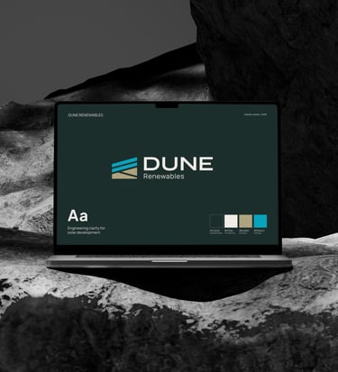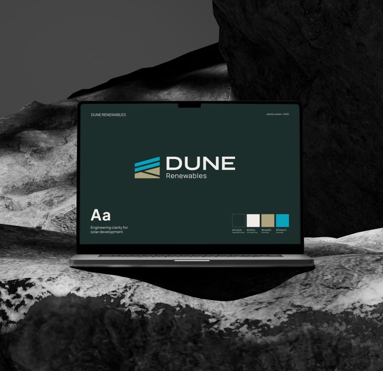 This visual identity was created for DUNE Renewables, a newly launched engineering and consultancy company working in the B2B solar sector. The goal was to build a launch-ready brand that feels professional and trustworthy, while still coming across as young, fresh, and contemporary.